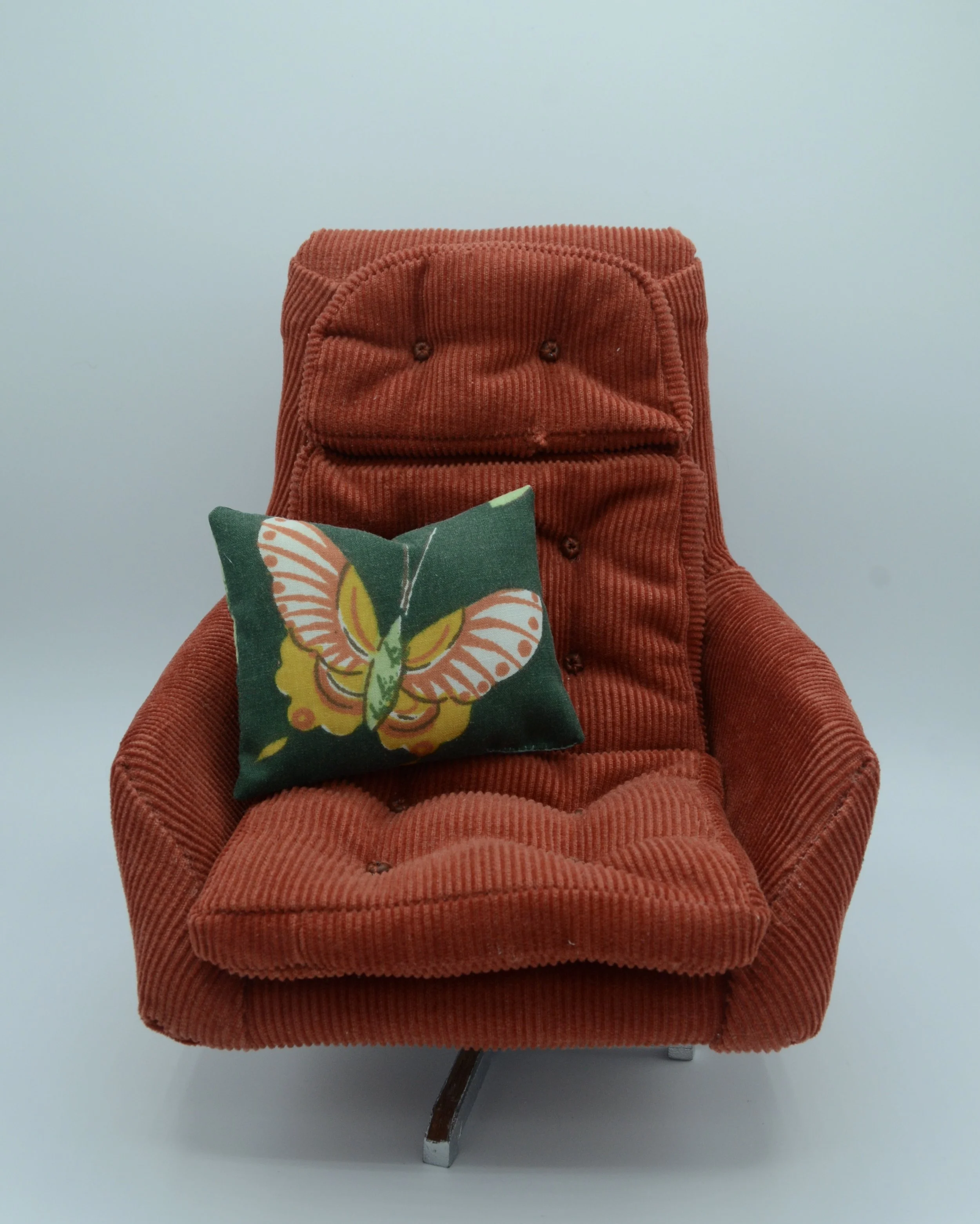 1/6th scale model of my 1972 turntable. Featuring a few well loved records and handmade blanket, this one made from crocheted embroidery floss.
