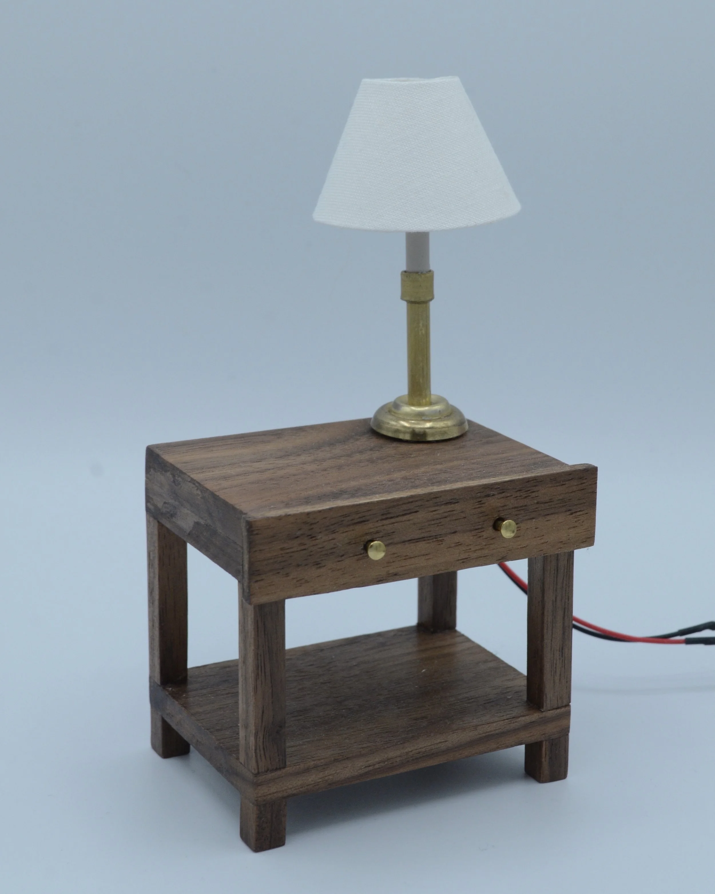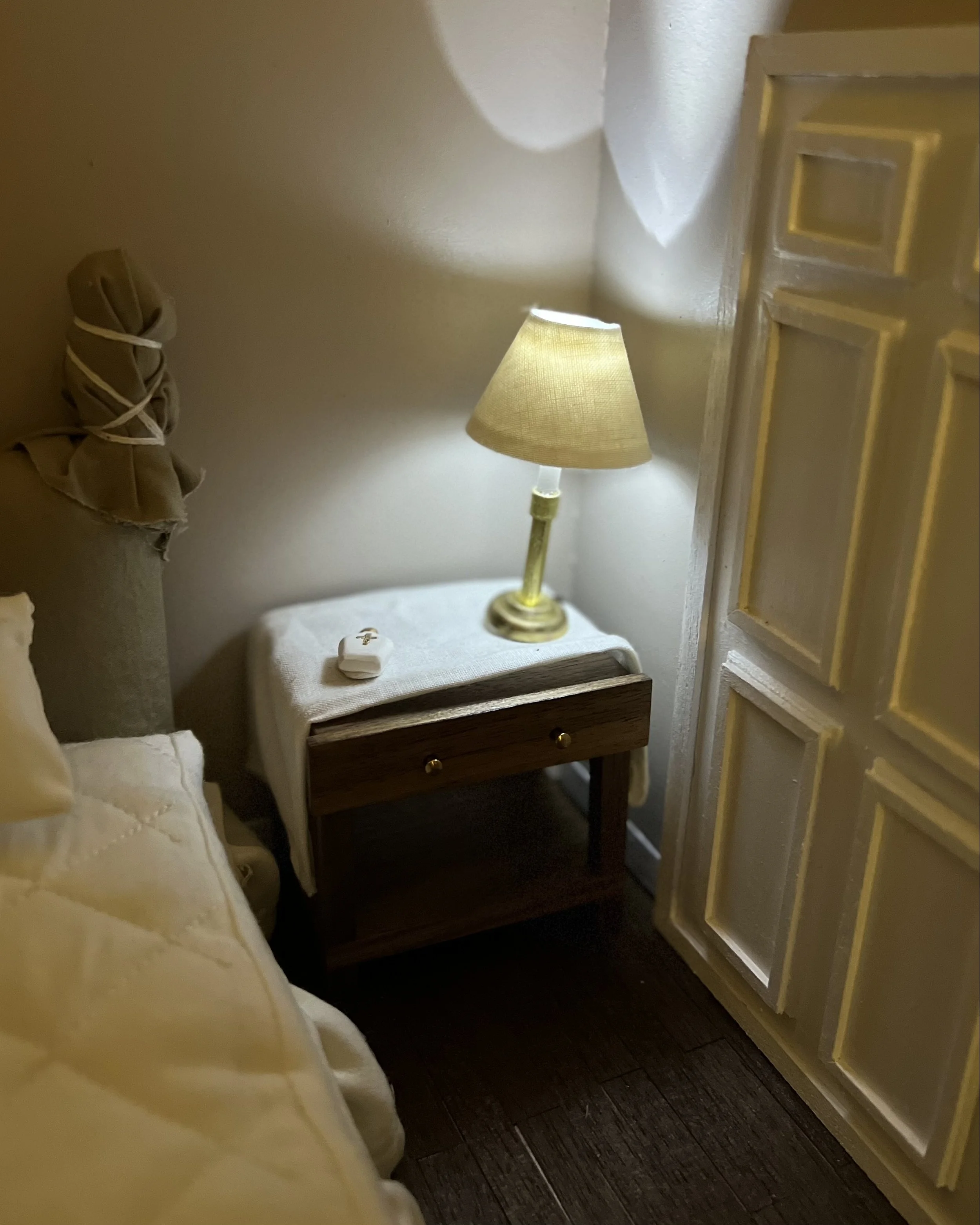 Materials: Set made from walnut wood, gator board, veneer, brass, clay, embroidery floss, fabric, and mini LEDs